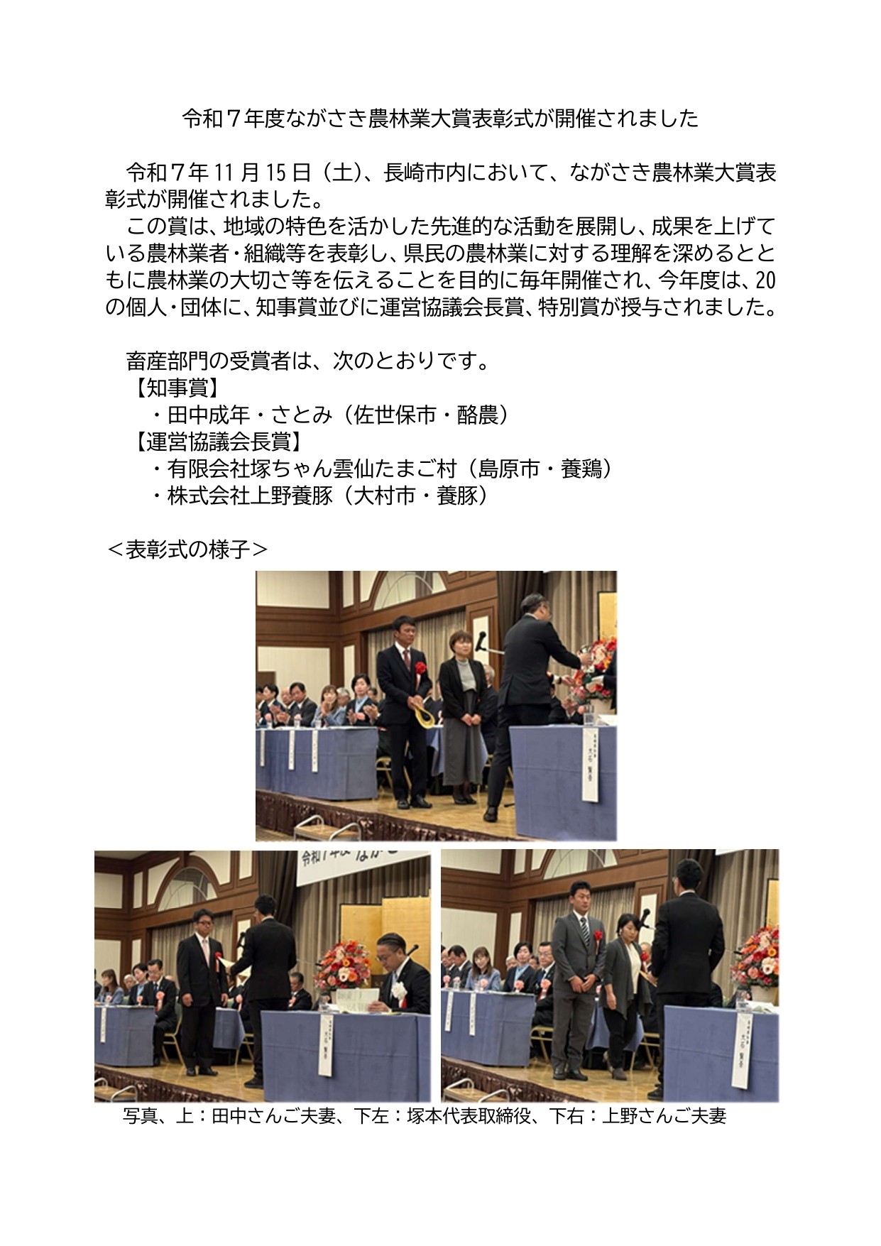 令和7年11月15日(土)、長崎市内において、ながさき農林業大賞表彰式が開催されました。